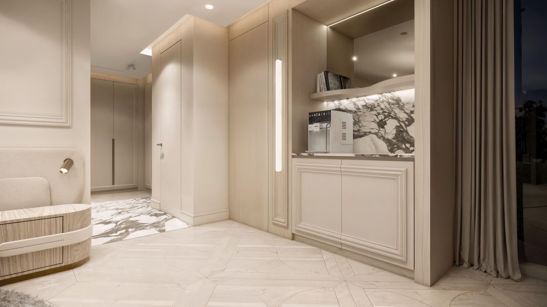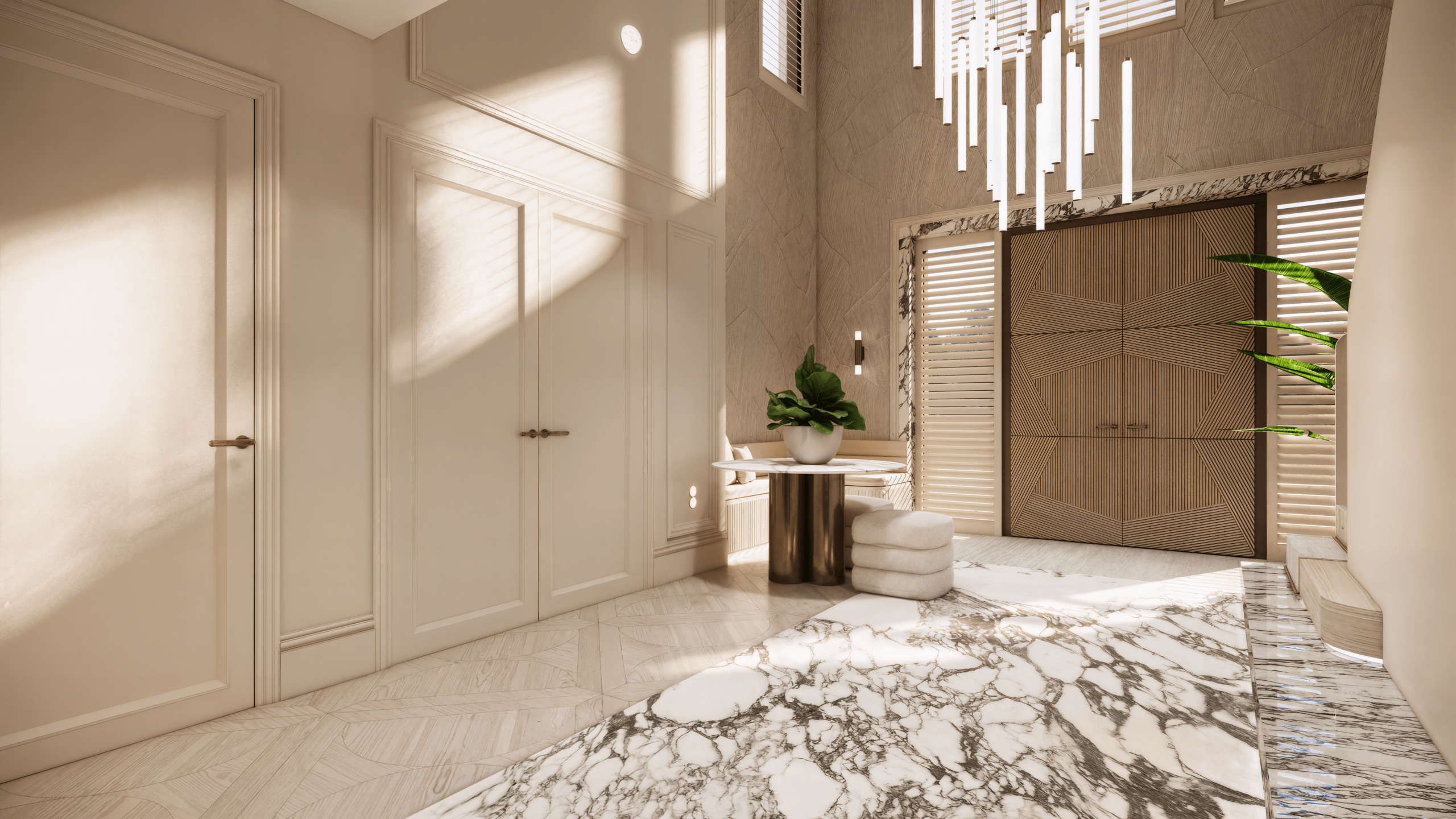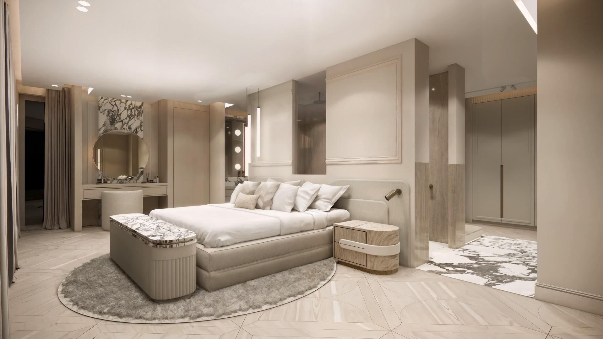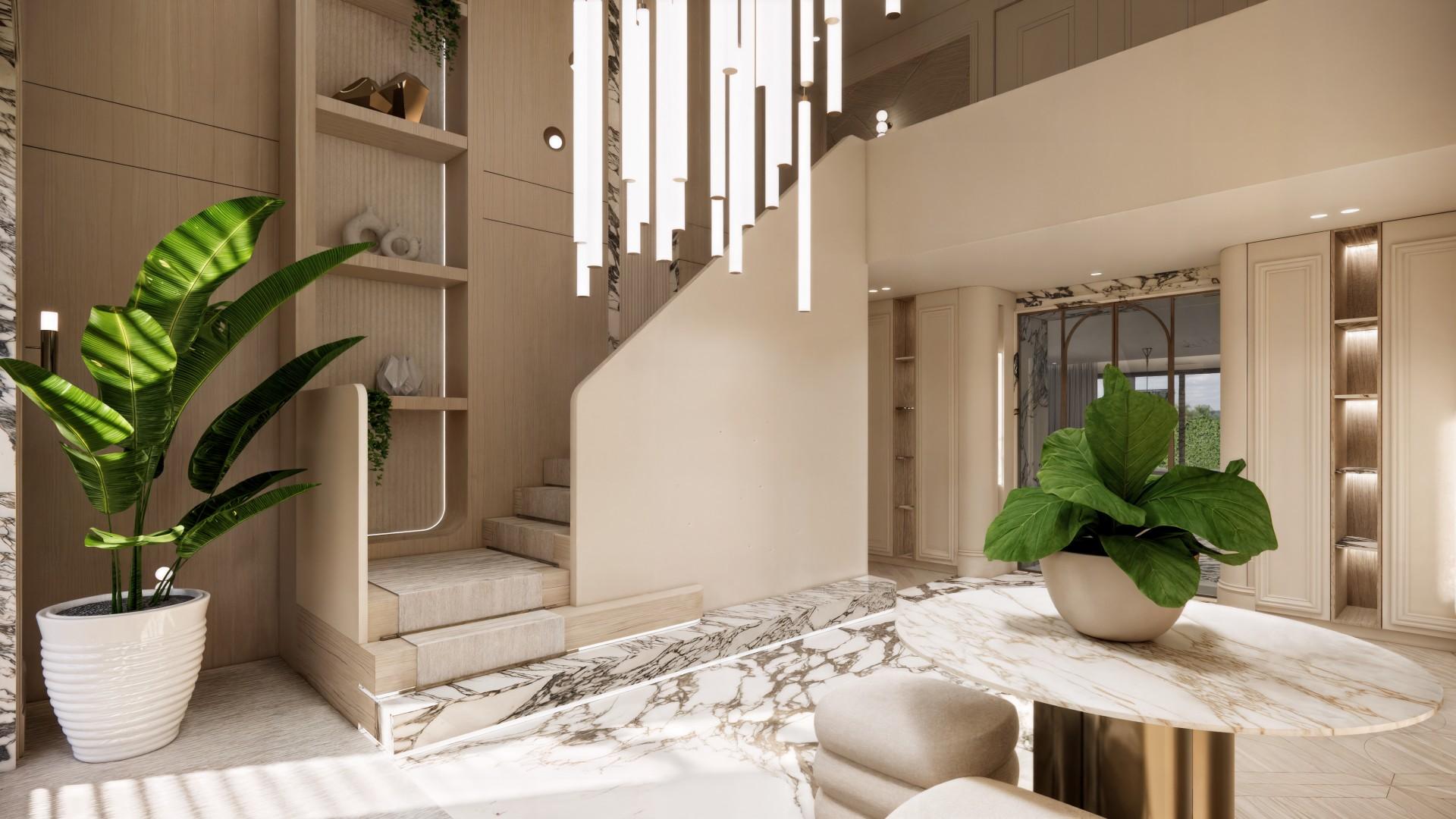 Voor dit project hebben we een uniek ontwerp gecreëerd dat de verfijnde uitstraling van internationale high-end hotels combineert met de warmte van een echt thuis. De balans tussen luxe en huiselijkheid staat centraal, waardoor de ruimte zowel imposant als uitnodigend aanvoelt. Door het gebruik van rijke materialen, lichte kleurtinten en elegant natuursteen ontstaat een serene basis die rust en verfijning uitstraalt. Daarnaast is de woning volledig voorzien van alle gemakken die een groot gezin nodig heeft, van slimme indelingen tot praktische oplossingen zonder concessies te doen aan stijl. Elke keuze — van materiaal tot functionaliteit — draagt bij aan een omgeving die je omarmt en waarin comfort, sfeer en luxe moeiteloos samenkomen.